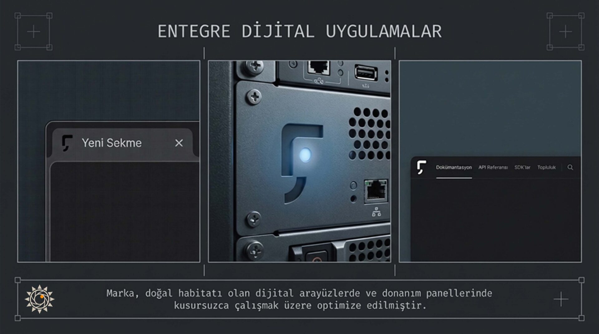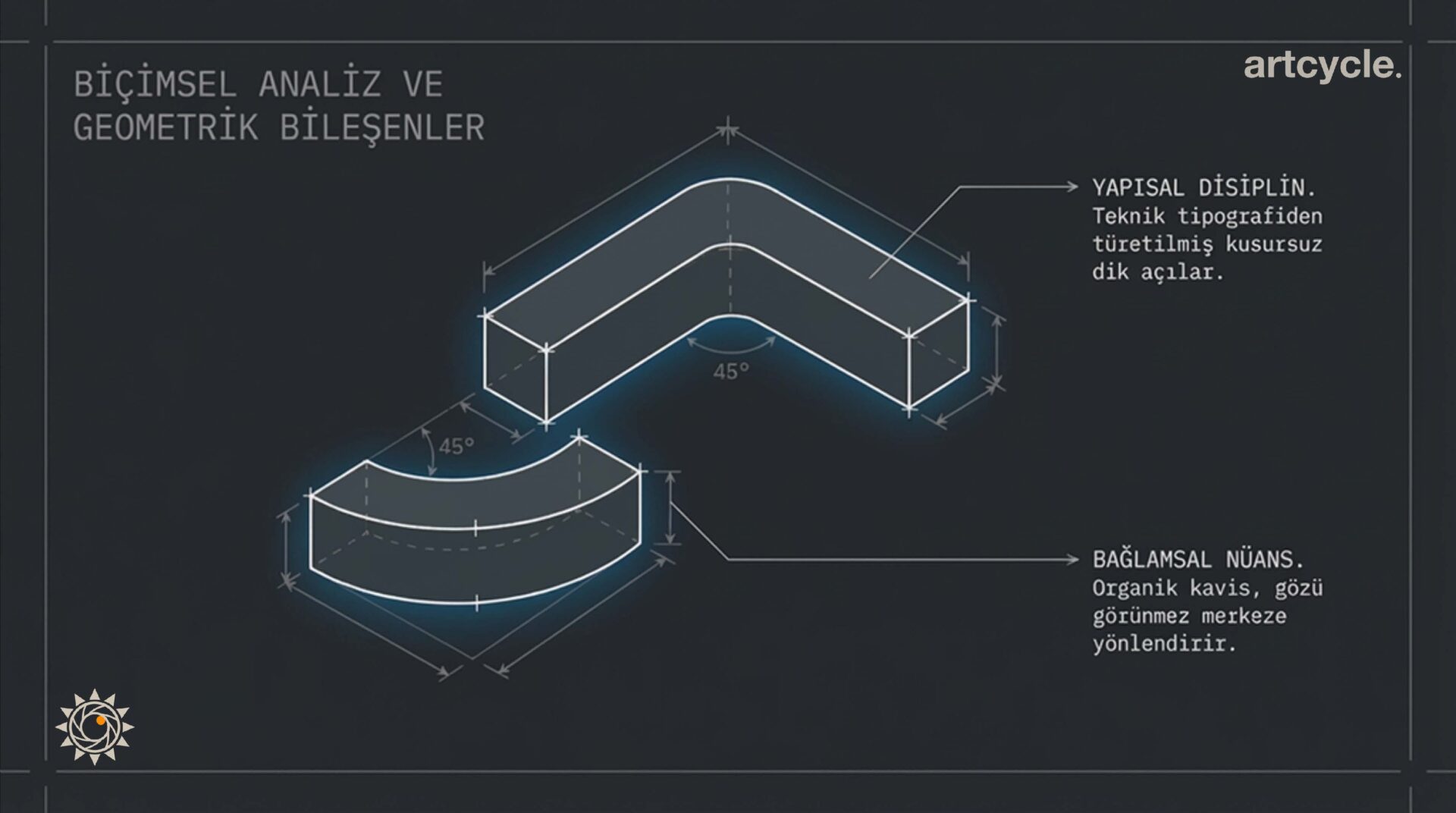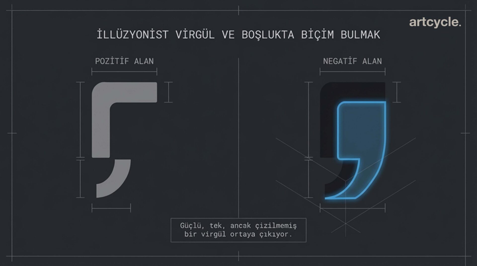 Tasarladığımız logo, ilk bakışta yazılım dilindeki köşeli parantezlere ve operatörlere atıfta bulunan iki farklı geometrik formdan (ters L ve altındaki kavisli gölge) oluşuyor. Ancak asıl sihir negatif alanda (negative space) yatıyor. İki form arasındaki o ‘boşluk’, gözümüzün istemsizce tamamladığı, güçlü, tek ve çizilmemiş bir virgül şeklini ortaya çıkarıyor. Tıpkı yazılımdaki görünmez bir hatanın (kayıp virgülün) aslında oradaki en önemli unsur olması gibi, logoda da asıl anlatılmak istenen şey çizilmeyen o boşlukta saklı.