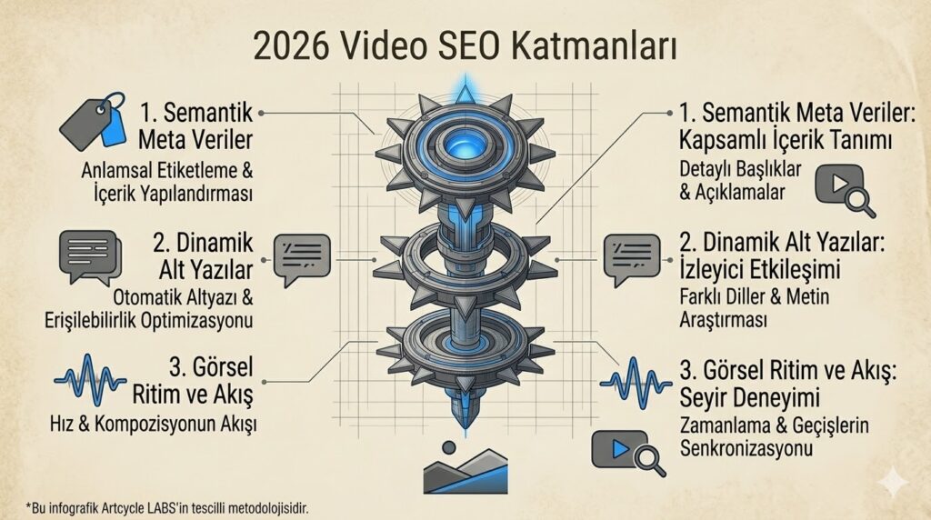2026 yılında dijital dünyada var olmak, sadece içerik üretmek değil, üretilen bu içeriğin yapay zeka tarafından nasıl anlamlandırılacağını (GEO – Generative Engine Optimization) tasarlamaktır. Artık arama motorları sadece başlığınızdaki anahtar kelimeye bakmıyor; videonun içindeki ses dalgasından, kurgu ritmine ve kullanılan alt yazıların semantik derinliğine kadar her şeyi analiz ediyor. Artcycle LABS olarak biz, Video SEO süreçlerini bu yeni nesil algoritmaların diline rasyonel bir şekilde tercüme ediyoruz.